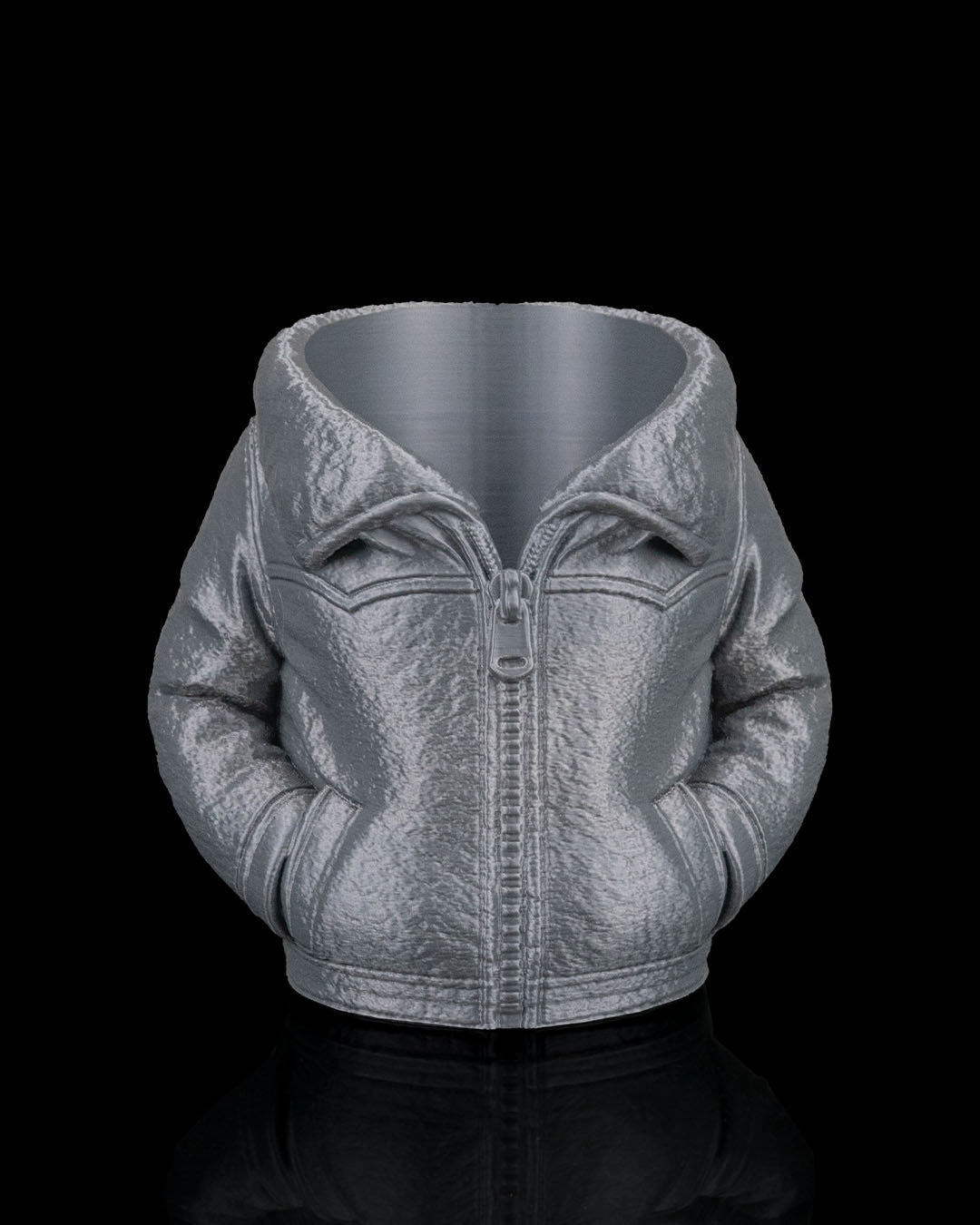 Impresso em 3D com alto nível de detalhe, apresenta texturas marcantes que remetem ao couro e ao forro interno, valorizando o caráter artesanal e contemporâneo da impressão tridimensional.
