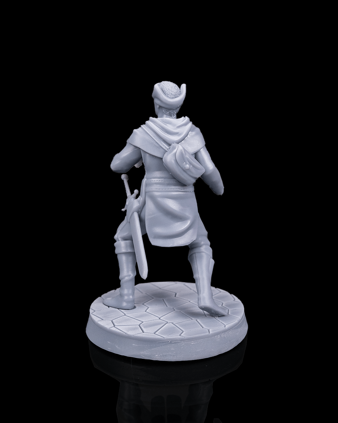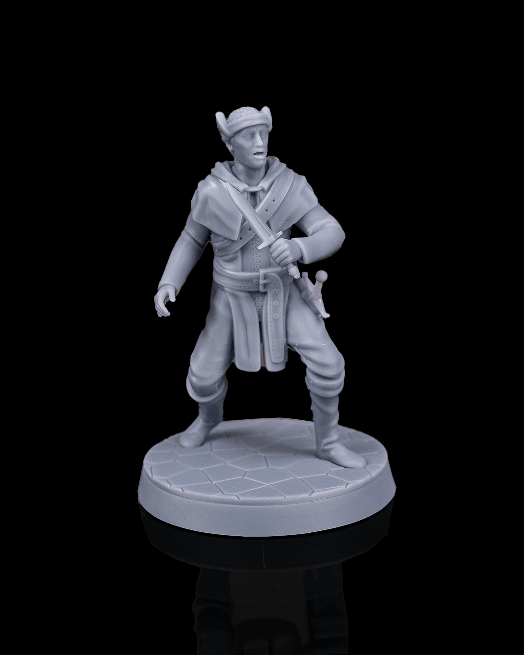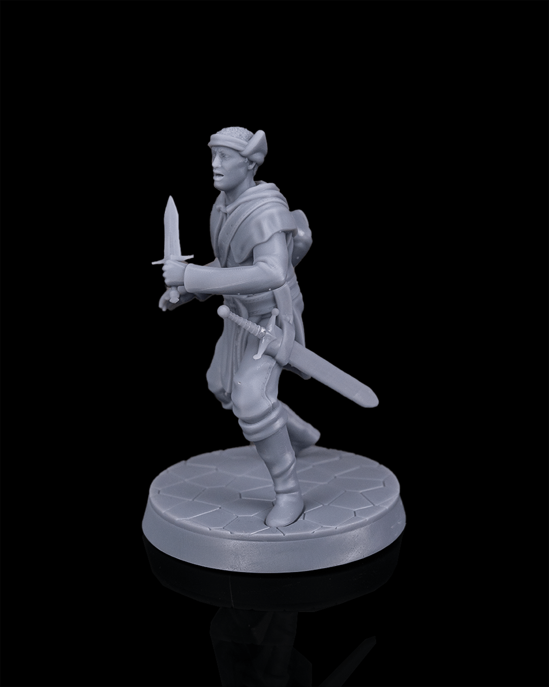 Um ladino astuto, armado com adaga e espada, pronto para problemas ou negócios obscuros.