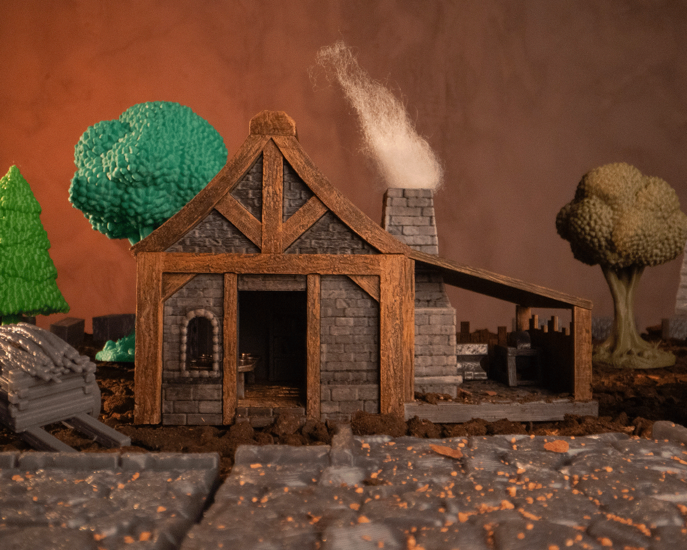 Esta forja medieval impressa em 3D foi concebida com riqueza de detalhes: paredes de pedra robustas, estrutura em madeira reforçada e uma chaminé que parece exalar o calor constante do fogo eterno. Uma peça perfeita para cenários de fantasia, RPG, wargames, dioramas ou como elemento decorativo de forte presença estética.